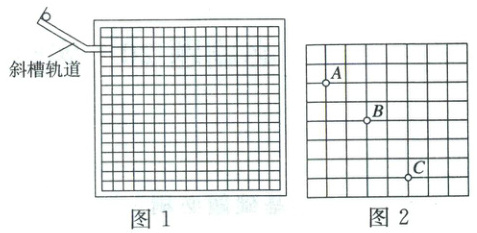 (2)如图 2 所示,某次实验所拍照片中同时出现了三个小球。已知该方格纸每小格的边长为 $ 5cm $,当地重力加速度 $ g $ 取 $ 10m/s^{2} $,忽略空气阻力,则玻璃球做平抛运动的水平初速度 $ v_{0} = $______ $ m/s $,如图 2 中 $ A $ 球所在位置到斜槽末端的水平距离 $ x_{0} = $______ $ m $。