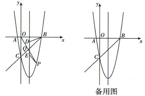 (2)点$P$是射线$BC$下方抛物线上的一动点,连接$OP$与射线$BC$交于点$Q$,点$D$,$E$为抛物线对称轴上的动点(点$E$在点$D$的下方),且$DE = 4$,连接$BD$,$PE$。当$\frac{PQ}{OQ}$取得最大值时,求点$P$的坐标及$BD + PE$的最小值;