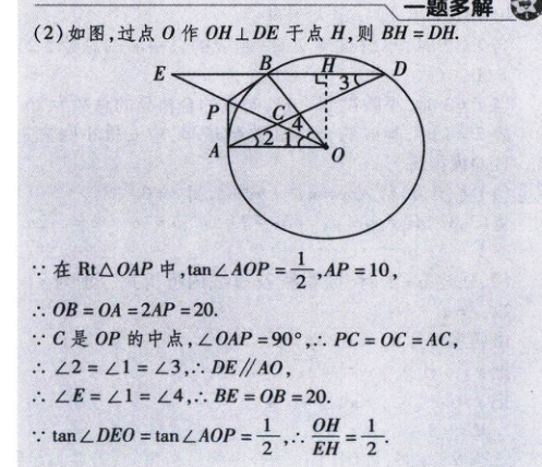(2)延长$OP$交$DB$的延长线于点$E$. 若$AP = 10$,$\tan\angle AOP=\frac{1}{2}$,求$DE$的长.