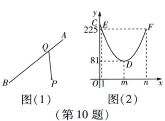 10. 新考法 几何图形与函数图象分析题 为了实时规划路径,卫星导航系统需要计算运动点与观测点之间距离的平方. 如图(1),点 $P$ 是一个固定观测点,运动点 $Q$ 从 $A$ 处出发,沿笔直公路 $AB$ 向目的地 $B$ 处运动. 设 $AQ$ 为 $x$(单位:$km$)($0 \leq x \leq n$),$PQ^{2}$ 为 $y$(单位:$km^{2}$). 如图(2),$y$ 关于 $x$ 的函数图象与 $y$ 轴交于点 $C$,最低点 $D(m, 81)$,且经过 $E(1, 225)$ 和 $F(n, 225)$ 两点. 下列选项正确的是(