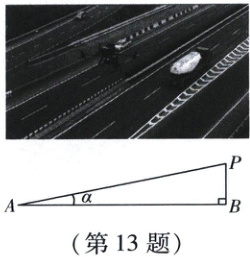 13. 无人机警戒在高速公路场景中的应用,是我国低空经济高质量发展的重要实践方向. 如图,在高速公路上,交警在 $A$ 处操控无人机巡查,无人机从点 $A$ 处飞行到点 $P$ 处悬停,探测到它的正下方公路上点 $B$ 处有汽车发生故障. 测得 $A$ 处到 $P$ 处的距离为500 m,从点 $A$ 观测点 $P$ 的仰角为 $\alpha$,$\cos \alpha = 0.98$,则 $A$ 处到 $B$ 处的距离为