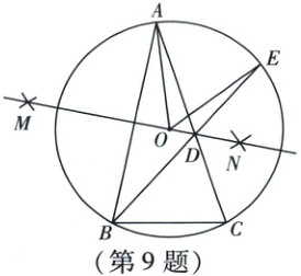 9. 如图,$ △ABC $ 内接于 $ ⊙O $,$ ∠BAC = 30° $. 分别以点 $ A $ 和点 $ B $ 为圆心,大于 $ \frac{1}{2}AB $ 的长为半径作弧,两弧交于 $ M,N $ 两点,作直线 $ MN $ 交 $ AC $ 于点 $ D $,连接 $ BD $ 并延长交 $ ⊙O $ 于点 $ E $,连接 $ OA,OE $,则 $ ∠AOE $ 的度数是