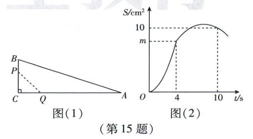 15. 如图(1),在 $ △ABC $ 中,$ ∠C = 90° $,$ BC = 4cm $,$ AB = n cm $. 动点 $ P,Q $ 均以 $ 1cm/s $ 的速度从点 $ C $ 同时出发,点 $ P $ 沿折线 $ C→B→A $ 向点 $ A $ 运动,点 $ Q $ 沿边 $ CA $ 向点 $ A $ 运动. 当点 $ Q $ 运动到点 $ A $ 时,两点都停止运动. $ △PCQ $ 的面积 $ S $(单位:$ cm^2 $)与运动时间 $ t $(单位:s)的关系如图(2)所示. (1)$ m =$