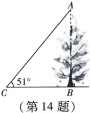 14. 如图,为了测量树$AB$的高度,在水平地面上取一点$C$,在$C$处测得$\angle ACB = 51^{\circ}$,$BC = 6m$,则树$AB$的高约为