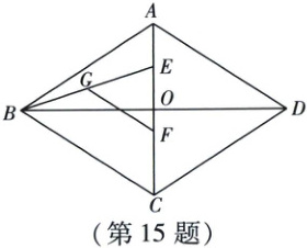 15. 如图,在菱形$ABCD$中,对角线$AC$与$BD$相交于点$O$,$AC = 8$,$BD = 12$,点$E$在线段$OA$上,$AE = 2$,点$F$在线段$OC$上,$OF = 1$,连接$BE$,点$G$为$BE$的中点,连接$FG$,则$FG$的长为