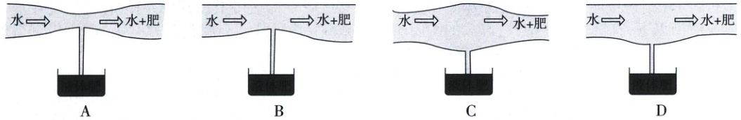 11. 新考法 创新设问 小华观察发现:同一河流,狭窄处比宽阔处水流更湍急。受此启发,他结合所学物理知识,设计了四种装置吸取液体肥,用于学校劳动基地水肥一体化灌溉,各装置剖面如图所示。在左端管口横截面积和水流流速相同的情况下,下列设计中吸肥最快的是 (