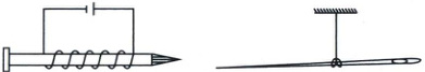 13. 小明在户外实践中,利用随身所带物品制作了简易指南针。他首先利用电池、带绝缘皮的导线、铁钉制成电磁铁,然后将缝衣针磁化并用细线水平悬挂,最后将两者靠近,静止时位置关系如图所示。下列说法正确的是 (