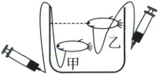 15. 小华在相同气球内装上不同配重做了两个“小鱼”,“小鱼”甲的质量大于“小鱼”乙的质量。注射器可以通过连接“小鱼”的软管对“小鱼”进行抽气和充气,从而改变“小鱼”的体积。初始时,两“小鱼”在水中处于静止状态,如图所示。忽略空气重力及软管对“小鱼”的作用力,“小鱼”所受浮力分别用$ F_甲 $、$ F_乙 $表示,下列说法正确的是 (