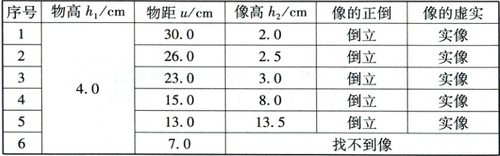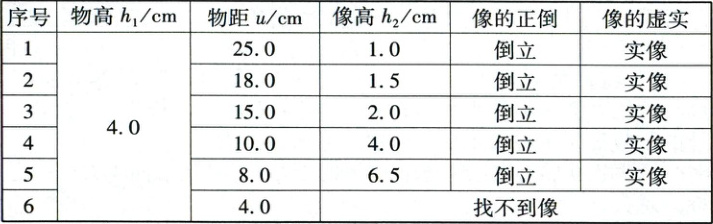 (2)比较表1中实验1~5可看出,当物距减小时,像的高度增大,且像一直都是倒立的。