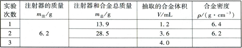 (2)同学们先测量了所选用注射器的质量$ m_{注} $,随后用注射器抽取适量的镓铟锡合金。他们发现抽取液态合金时,注射器中会有气泡,于是将气泡排出后,读取合金的体积$ V $,并用天平测量它们的总质量$ m_{总} $。将测量和计算出的数据填入表格。