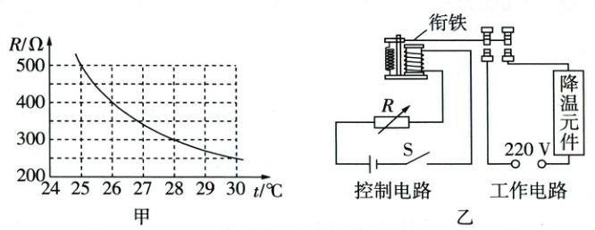 13. (7分)海龟性别由孵化温度决定。某种海龟在温度$t\geqslant30\ ^{\circ}C$时,孵化出来的几乎全为雌性;温度$t\leqslant28\ ^{\circ}C$时,孵化出来的几乎全为雄性。因气候变暖导致自然界雌海龟数量远多于雄海龟。为能在外界环境温度高于$30\ ^{\circ}C$的情况下孵化雄海龟,需要设计一个自动温控孵化箱:要求箱内的最高温度为$28\ ^{\circ}C$,且最低温度不得低于$25\ ^{\circ}C$。科技小组利用如下器材:控制电路电源(电压为$12\ V$)、热敏电阻$R$(阻值随温度变化曲线如图甲所示)、电磁继电器(当电磁铁线圈电流$I\geqslant0.04\ A$时,吸下衔铁;当$I\leqslant0.03\ A$时,弹开衔铁;线圈电阻忽略不计)、降温元件(额定电压$220\ V$,额定功率$44\ W$)、开关及导线若干,设计了孵化箱电路如图乙所示。