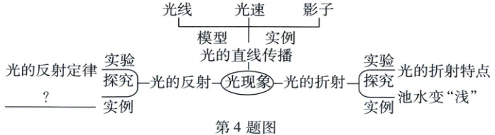 4. 新考法 思维导图构建 小亮在梳理光现象知识时绘制了如下思维导图,其中一个分支的实例内容有缺失。下列选项能正确补充的是 ( )