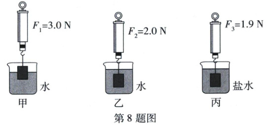 8. 某同学用同一个圆柱体探究浮力的大小跟哪些因素有关,弹簧测力计示数如图所示,图甲中的圆柱体有一半体积浸入水中。下列结论