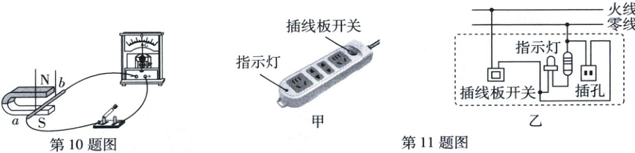 11. 图甲是一个常用的插线板,图乙是其内部元件连接的示意图。将一盏台灯的插头插入插线板的插孔内,闭合插线板开关和台灯开关,台灯正常发光。下列说法正确的是(
