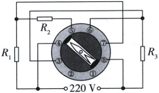 12. 如图所示是某电炖锅的简化电路图,旋转开关内有一块绝缘圆盘,在圆盘边缘有8个金属触点,绕中心轴转动的绝缘旋钮两端各有一个金属片,转动旋钮可将相邻金属触点连通。电炖锅通过旋转开关可以实现快炖、慢炖和保温功能,$R_{1}$、$R_{2}$和$R_{3}$均为加热电阻,且$R_{1}=R_{3}$。电炖锅的部分参数如下表所示。下列结论正确的是(