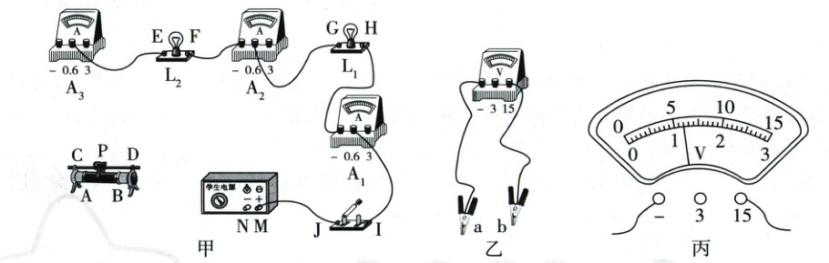 (1)滑动变阻器应串联在电路中,滑片P向D移动时电路电流增大(关键信息),说明其接入电路的电阻变小,故应将滑动变阻器的B接线柱与电源负极连接、C或D接线柱与电流表A₃的“ - ”接线柱连接。