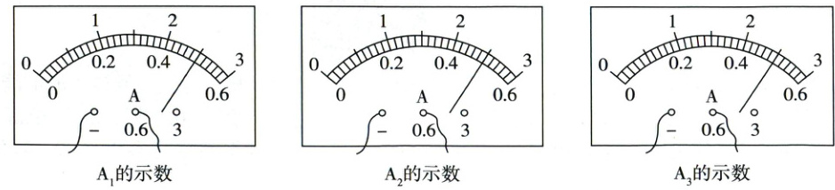 (6)第一次实验时,三个电流表选用的测量范围均为0~0.6A,分度值0.02A,示数均为0.5A。记录实验数据的表格应包含实验次数(至少3次)、A₁的示数I₁、A₂的示数I₂、A₃的示数I₃等内容,并将第一次数据填入对应位置。