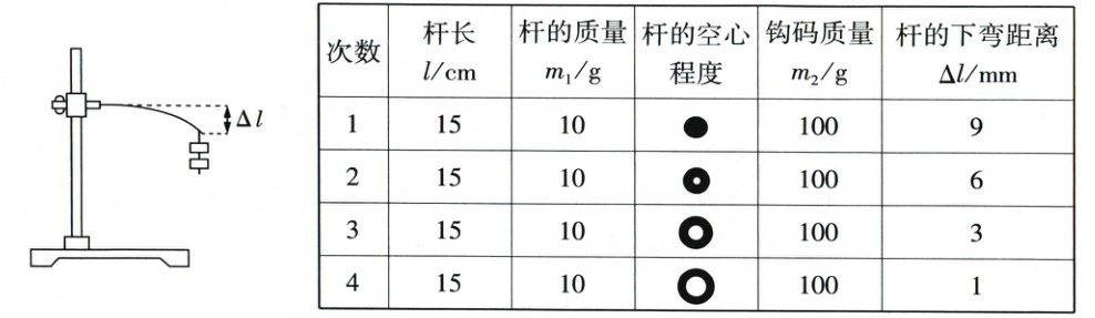 实验过程:如图所示,将杆的一端水平固定在铁架台上,在杆的另一端挂一定数量的钩码,用刻度尺测量杆的下弯距离$\Delta l$。换用不同的空心杆,重复上述操作,记录数据如下表。