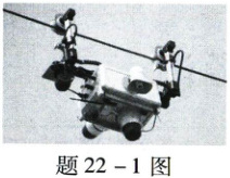 22. 巡检机器人可对高压输电线进行巡检,如题22-1图,其相关参数见题22表。机器人的电机可切换为电动机或发电机。水平匀速巡检时,蓄电池减少的储能全部用于电机产生的牵引力做功。当蓄电池储能降至$ 0.1E_0 $时,停止电能输出,巡检终止。下坡巡检时,电机可将重力势能转化为电能并为蓄电池充电,将能量储存起来。