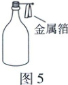 9. 如图5,大头针插在玻璃瓶的软木塞上,把金属箔悬挂在大头针上。带电体接触大头针后,金属箔张开,此过程 (