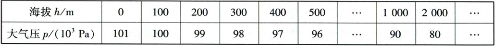 (1)由表知,h=0时,大气压p₀=1.01×10⁵ Pa。由p=F/S得,活塞受到的压力F₀=p₀S=1.01×10⁵ Pa×4×10⁻³ m²=404 N。