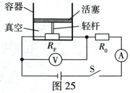 31. (9分)图25为科创小组测量大气压和海拔的简易装置原理图,$R_0$为定值电阻,$R_F$为力敏电阻,$R_F$置于圆柱体容器底部,可自由滑动的活塞通过轻杆压在力敏电阻上。容器内抽成真空,装置气密性良好。该装置通过两电表示数分别转换测出大气压值和海拔,且示数均随测量值增大而增大。电源电压恒为6 V,$R_0=30\ \Omega$,$R_F$的阻值与压力大小$F$的数学关系为$R_F=1030-2.5F$,电压表量程为0~3 V,电流表量程为0~0.6 A。活塞横截面积为$4×10^{-3}\ m^2$,忽略摩擦,不计活塞质量。查阅资料,大气压$p$与海拔$h$的关系如下表。