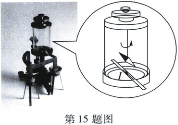 15. 欧姆当年研究电流跟电阻和电压关系时,电流大小还不能准确测量,他巧妙设计了如图所示的装置来测量电流,用一根细丝悬挂磁针,平行放置在导线上方,当电路中有电流时,导线周围产生