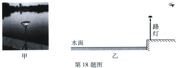18. (2分)如图甲为校园摄影展中小芳的作品,太阳在湖中的倒影“镶嵌”在湖边的路灯中。为解释通过路灯的空隙看到太阳的像,请在图乙中画一条太阳光经水面反射到人眼的光路。(保留作图痕迹)