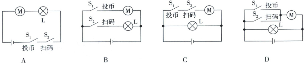 12. 某商场有一台棉花糖自助售货机,接通电源后,指示灯L一直发光,人们可通过投币或扫码的方式购买棉花糖。当投币或扫码成功时,对应开关闭合,电动机开始工作,完成棉花糖自动出售服务。下列设计的模拟电路图符合以上要求的是 ()