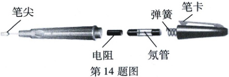 14. 某试电笔的构造如图所示。正确使用试电笔时,手指按住笔卡,用试电笔的