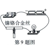 9. 在如图所示的电路中,用点燃的蜡烛对镍铬合金丝加热,发现小灯泡缓慢变暗。分析可知,镍铬合金丝的阻值变大。而导致其阻值变化的主要因素是 ()