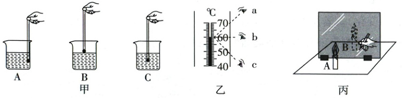(2)在探究平面镜成像大小与物体大小的关系实验中,如图丙所示,在玻璃板前放置一支点燃的蜡烛A,可以看到它在玻璃板后面的
