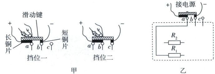 14. 新情境 可调温电热垫 小明设计了一款可调温电热垫,其调温开关的结构及工作原理如图甲所示,绝缘滑动键上固定有长、短两块铜片,两铜片分别与电源两极相连;拨动滑动键,改变两铜片与a、b、c三个触点的接触方式来切换挡位。图乙是电热垫内部未完成的电路图,若电源两端电压U=4.8V,两电阻丝阻值分别为R₁=12Ω、R₂=4Ω。不添加器材,请在图乙的虚线框内完成电路图,使其满足以下要求: