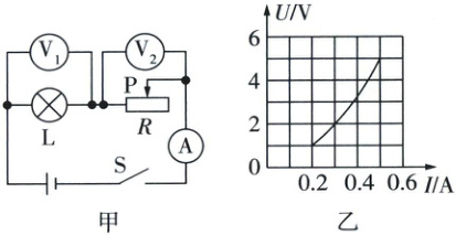 两端的电压。电源两端电压保持不变,闭合开关S,将滑动变阻器滑片P由最右端移至最左端,此过程中,其中一个电压表示数与电流表示数的关系如图乙所示。当滑动变阻器接入电路的阻值为其最大阻值的一半时,它消耗的电功率为0.45