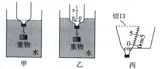 小明切掉饮料瓶底部,用细线将瓶盖与其中一个重物连接,旋紧瓶盖,将瓶体开口向上倒置于水槽中,待其静止后,若瓶体呈竖直状态,且与重物整体漂浮,则秤体制作完成,如图甲所示。此时瓶体便可作为秤盘盛放待测物体。
