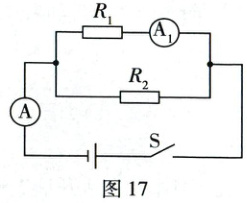 22. 如图17所示的电路中,电源电压$U = 6\ V$,电阻$R_{2} = 5\ \Omega$。闭合开关S,电流表$A_{1}$的示数$I_{1} = 0.3\ A$。求: