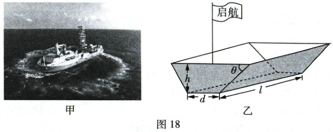 (4) 新趋势 模型建构 为了研究“梦想”号钻探船从桥下安全通行的高度问题,科创小组用两块相同的等腰梯形板材和三块长边均为$l = 4\ m$的矩形板材,制作了如图18乙所示的“启航”号实验船,板材不吸水且厚度不计。船底短边$d = 1\ m$,船身高度$h = 1\ m$,$\theta = 45^{\circ}$,船头竖立有旗杆。将船放入平静的湖水中进行实验,当装载$m = 1\ 800\ kg$货物时吃水深度为$h_{1} = 0.4\ m$。若桥离水面的高度$H = 3\ m$,要实验船始终能安全通过此桥,求旗杆的最大高度。(货物高度始终低于旗杆顶部,$\rho_{水} = 1.0×10^{3}\ kg/m^3$)