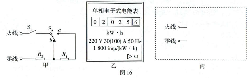 20. 小渝家有一台旧式两挡位电炖锅,高温挡额定功率为$550\ W$,低温挡额定功率模糊不清,图16甲是该电炖锅简化电路图,$R_1$和$R_2$是加热电阻丝,开关$S_2$只能接触$a$或$b$,不计温度对电阻的影响。