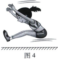 6. 立定跳远是同学们熟悉的体育项目。在立定跳远时,人站在地面上,下蹲后用力向后蹬,从而获得向前的力,使人向前的力的施力物体是。如图4,人起跳后,在空中继续向前运动,最终落向地面,请从物理学的角度简要解释这一现象:。
