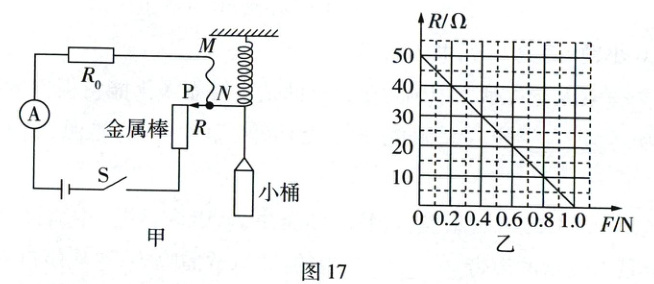 21. 图17甲为一款测量液体密度的装置设计图。电源电压为12 V,$R_{0}$为一定值电阻,MN间是足够长的轻质导线,金属棒竖直固定且粗细均匀。一弹簧上端固定,滑片P固定在弹簧下端,与金属棒之间无摩擦且接触良好。已知金属棒接入电路的阻值R与弹簧所受拉力F的关系如图17乙所示。容积为40 cm³的小桶通过轻绳挂在弹簧下端,闭合开关S,桶内未装液体时,电流表示数为0.2 A;测量密度时,需在桶内装满待测液体,通过读取电流表示数可得出液体密度。(不计弹簧、滑片及小桶的质量)