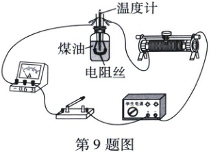 9. 小张同学利用如图所示的实验装置测量煤油的比热容。实验中,在一段时间内电阻丝产生$400\ J$的热量,质量为$0.04\ kg$的煤油温度升高了$5\ ^{\circ}C$,若电阻丝产生的热量全部被煤油吸收,则煤油的比热容为