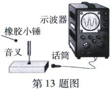 13. 如图所示,用橡胶小锤敲击音叉,音叉发出的声音用话筒间接接收,将声信号转换成电信号,这个带有声音特征的电信号通过示波器中的波形图显示出来。下列说法正确的是 (