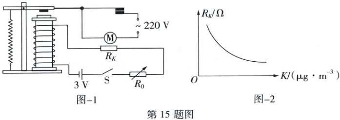 15. (4分)如图-1是室内自动换气系统的电路图。控制电路的电源电压为3 V,R₀为电阻箱,R_K的阻值与烟雾浓度K的关系如图-2所示。当电磁铁线圈中的电流I≥0.03 A时,衔铁被吸下,电风扇转动,开始排气。