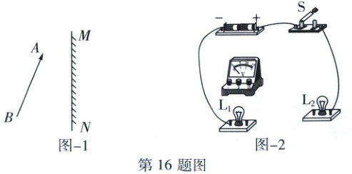 16. (4分)(1)如图-1,请根据平面镜成像特点,画出物体AB在平面镜中所成的像A'B'。