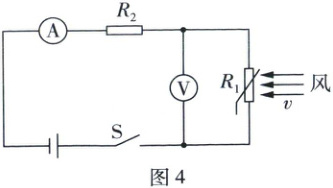 10. 如图4是某研究小组设计的风速自动报警器电路示意图,电源电压不变,$R_{1}$为压敏电阻,它的阻值随风速$v$的增大而减小,$R_{2}$为定值电阻。当风速$v_{1}\lt v\lt v_{2}$时,两电表都不报警。当风速$v\leq v_{1}$时,两电表中的一个会报警;当风速$v\geq v_{2}$时,另一个电表会报警。已知:$v_{1}\gt0$,两电表都是在大于或等于各自设定的电压值或电流值时触发报警。在电路处于两电表都未报警的工作状态下,下列说法正确的是 (