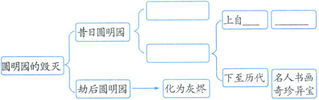 :上自先秦时代的青铜礼器,下至唐、宋、元、明、清历代的名人书画和各种奇珍异宝。所以,它又是当时世界上最大的博物馆、艺术馆。③1860年10月6日,英法联军侵入北京,闯进圆明园。他们把园内凡是能拿得动的东西,统统掠走;拿不动的,就用大车或牲口搬运;实在运不走的,就任意破坏、毁掉。为了销毁罪证,10月18日和19日,三千多名侵略者奉命在园内放火。大火连烧三天,烟云笼罩了整个北京城。我国这一园林艺术的瑰宝、建筑艺术的精华,就这样化为一片灰烬。