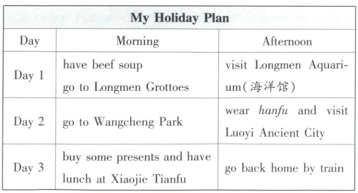 Hello, I'm Ben. I will have a 3 - day trip in Luoyang. I make a trip plan. On the 1. ______ day, I'm going to have some beef soup and go to Longmen Grottoes in the morning. I will 2. ______ Longmen Aquarium in the afternoon. The next day, we will go to Wangcheng Park in the morning. In the afternoon, I will 3. ______ hanfu and visit Luoyi Ancient City. The last day, I'm going to buy some 4. ______ for my friends and have lunch at Xiaojie Tianfu. Then I will go back home by 5. ______ with my parents.