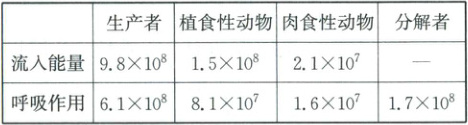 解析:肉食性动物不一定捕食植食性动物,如也可捕食肉食性动物,因此肉食性动物不一定处在食物链的第三营养级,A错误;相邻营养级间的能量传递效率一般在10%~20%,相邻营养级间的能量传递效率不一定都相同,如植食性动物由于分解纤维素的能力低,导致第一营养级和第二营养级之间的能量传递效率低,B错误;流入植食性动物的能量为初级消费者的同化量,摄入量=同化量+粪便量,因此初级消费者摄入的总能量应大于$1.5×10^8(J·m^{-2}·a^{-1})$,C错误;该生态系统未利用的能量=生产者同化的能量-所有生物呼吸散失的能量=$9.8×10^8-6.1×10^8-8.1×10^7-1.6×10^7-1.7×10^7$=$1.03×10^8(J·m^{-2}·a^{-1})$,D正确。