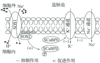 2. (2025·河南三模)土壤钠盐过高对植物的伤害作用称为盐胁迫。研究发现拟南芥可通过 SOS 转导途径增强耐盐性,调节机制如图所示。盐胁迫出现后,细胞膜上某种磷脂分子 PA 含量迅速增加并与 SOS2 结合,一方面使 SOS1 被激活后利用 $ H^{+} $ 电化学势能转运 $ Na^{+} $,另一方面又使钙调蛋白 SCaBP8 磷酸化,磷酸化的 SCaBP8 对 $ K^{+} $ 内流的抑制作用减弱,从而调节细胞内 $ Na^{+}/K^{+} $ 的稳态。下列说法错误的是(