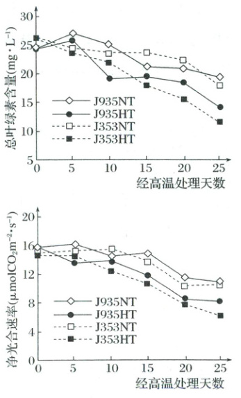(2)由题意可知,高温胁迫下植物净光合速率下降最初主要因气孔因素(气孔关闭,CO₂供应不足)。所以检测J935的气孔导度,预期结果是HT条件下的气孔导度低于NT条件下的气孔导度。